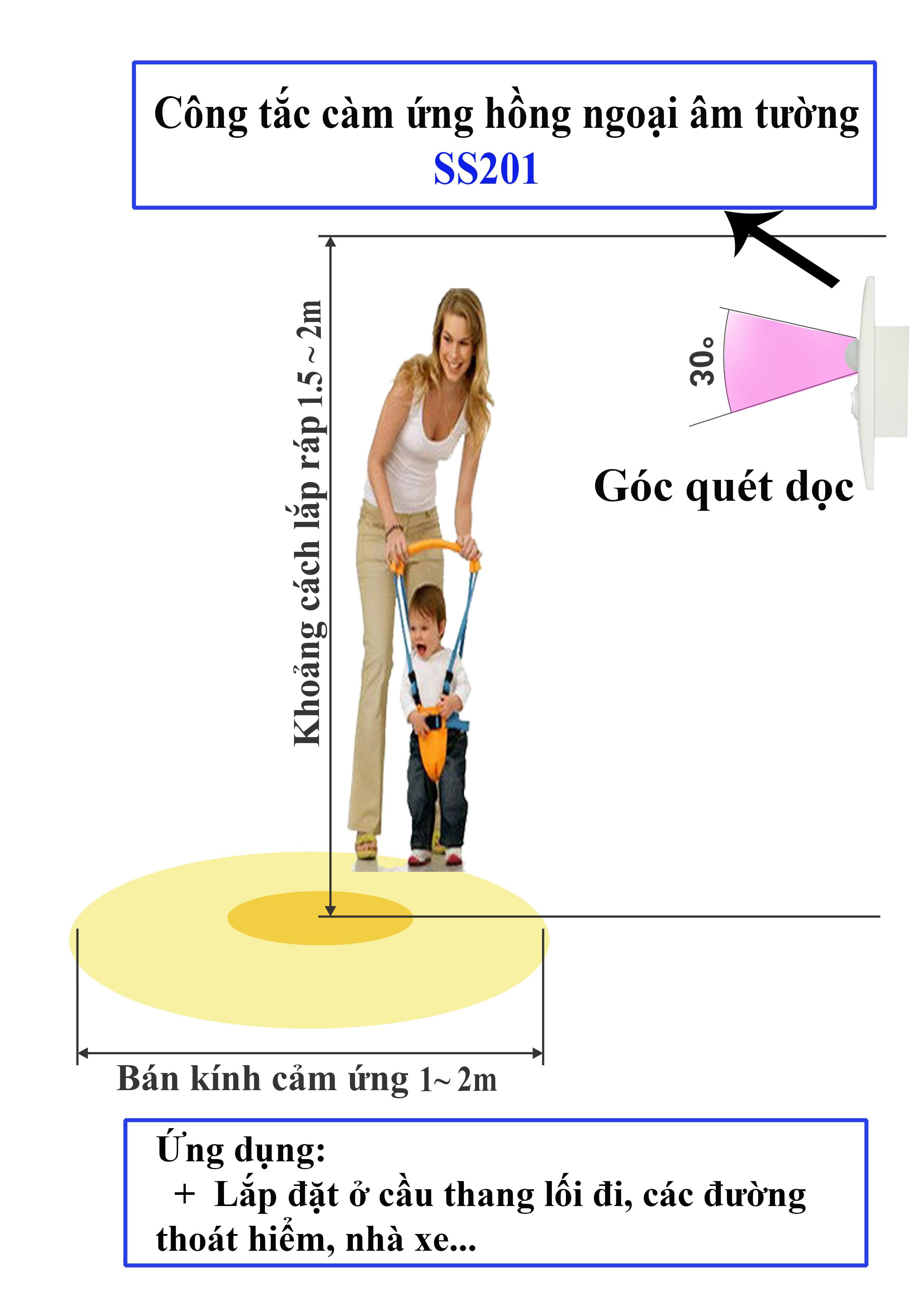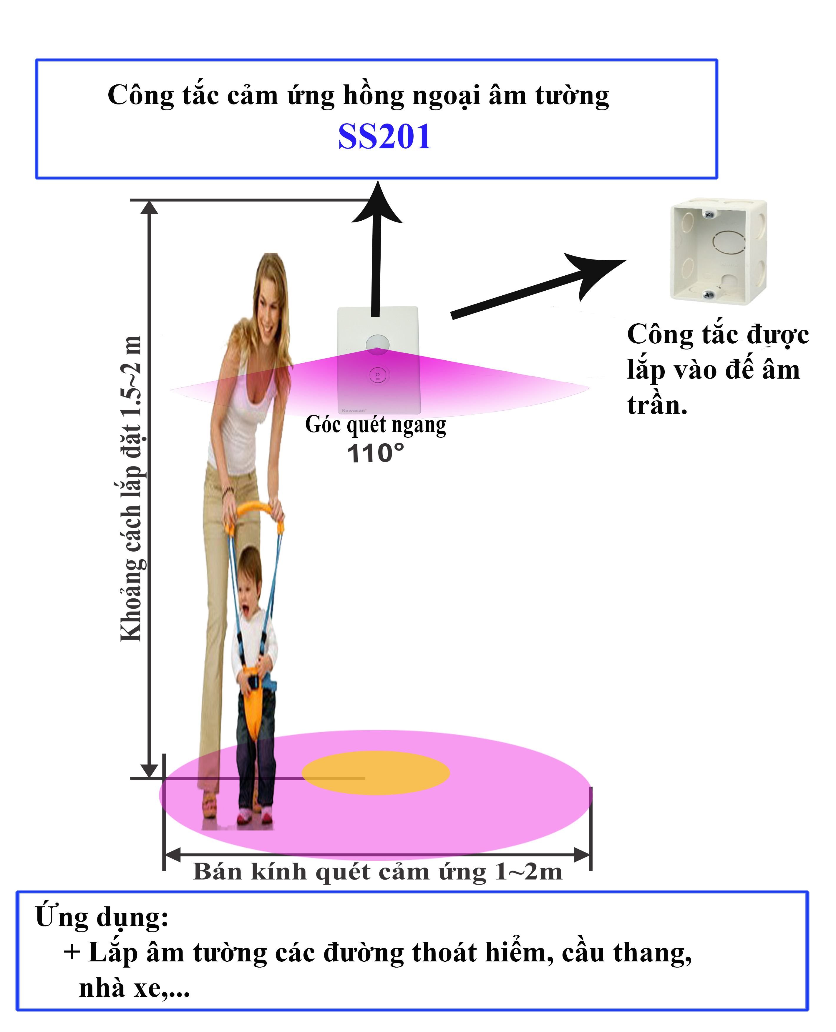 Mô tả công tắc cảm ứng cầu thang, hành lang cảm ứng hồng ngoại âm tường Kawasan SS201