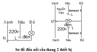 - Kết nối dây nguồn và tải cho cảm ứng như sơ đồ trên (Dây Xanh và Nâu đấu vào nguồn điện 220V ,Dây Xanh và Dây Đỏ ra đèn)