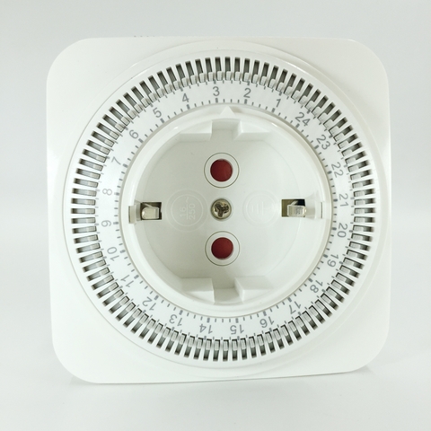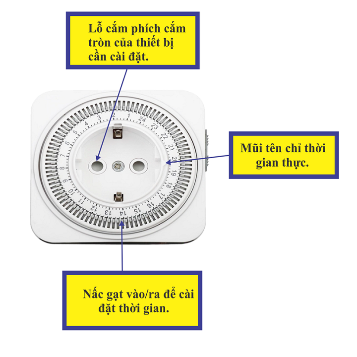 Đây là loại ổ cắm hẹn giờ, công tắc thời gian dạng cơ (hay còn gọi là Timer 24 giờ dạng cơ), trên mặt đồng hồ có mũi tên chỉ thời gian thực tế và khi cắm vào ổ điện đồng hồ sẽ bắt đầu làm việc, nếu cúp điện đồng hồ sẽ ngưng chạy và phải xoay lại đồng hồ về thời gian thực tế để làm thiết bị làm việc theo chương trình đã cài đặt .thời gian cài đặt tối thiểu 15 phút (không có pin dự trữ), có 96 nấc gạt.
