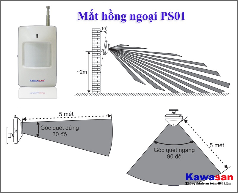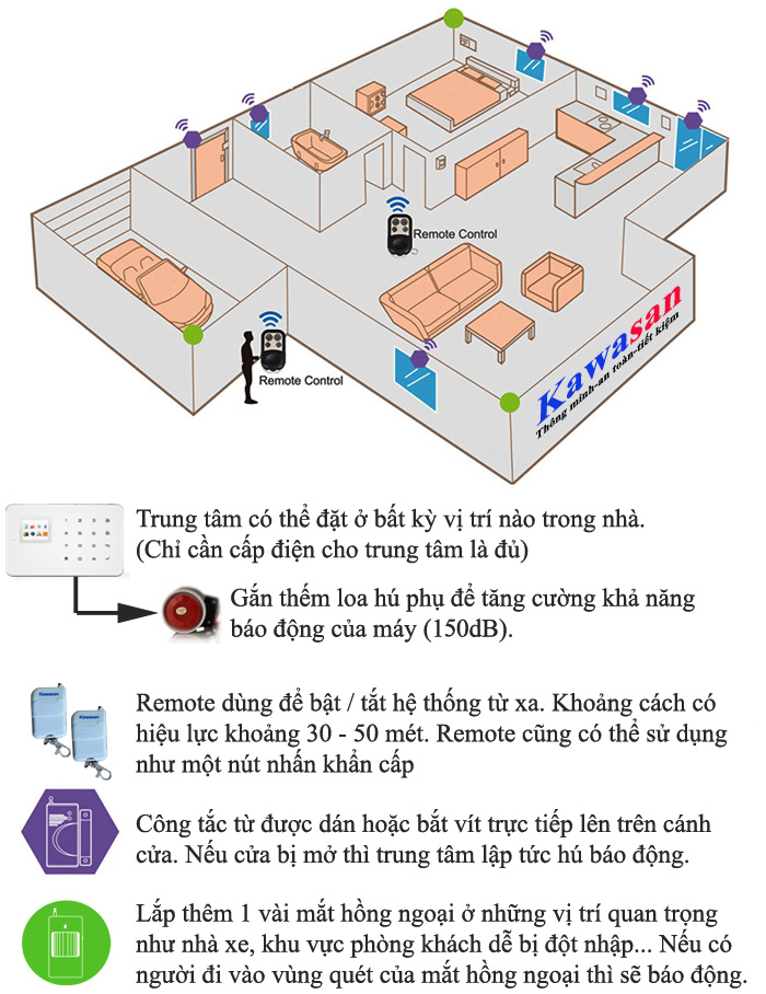 - Âm lượng báo động: loa rời 110dB, thời gian báo động 60~ 300 giây (mặc định 60 giây).