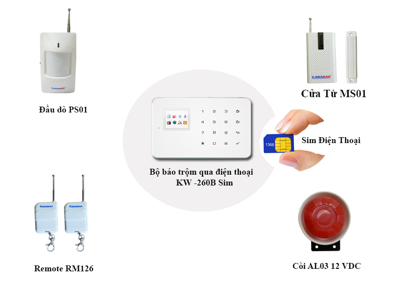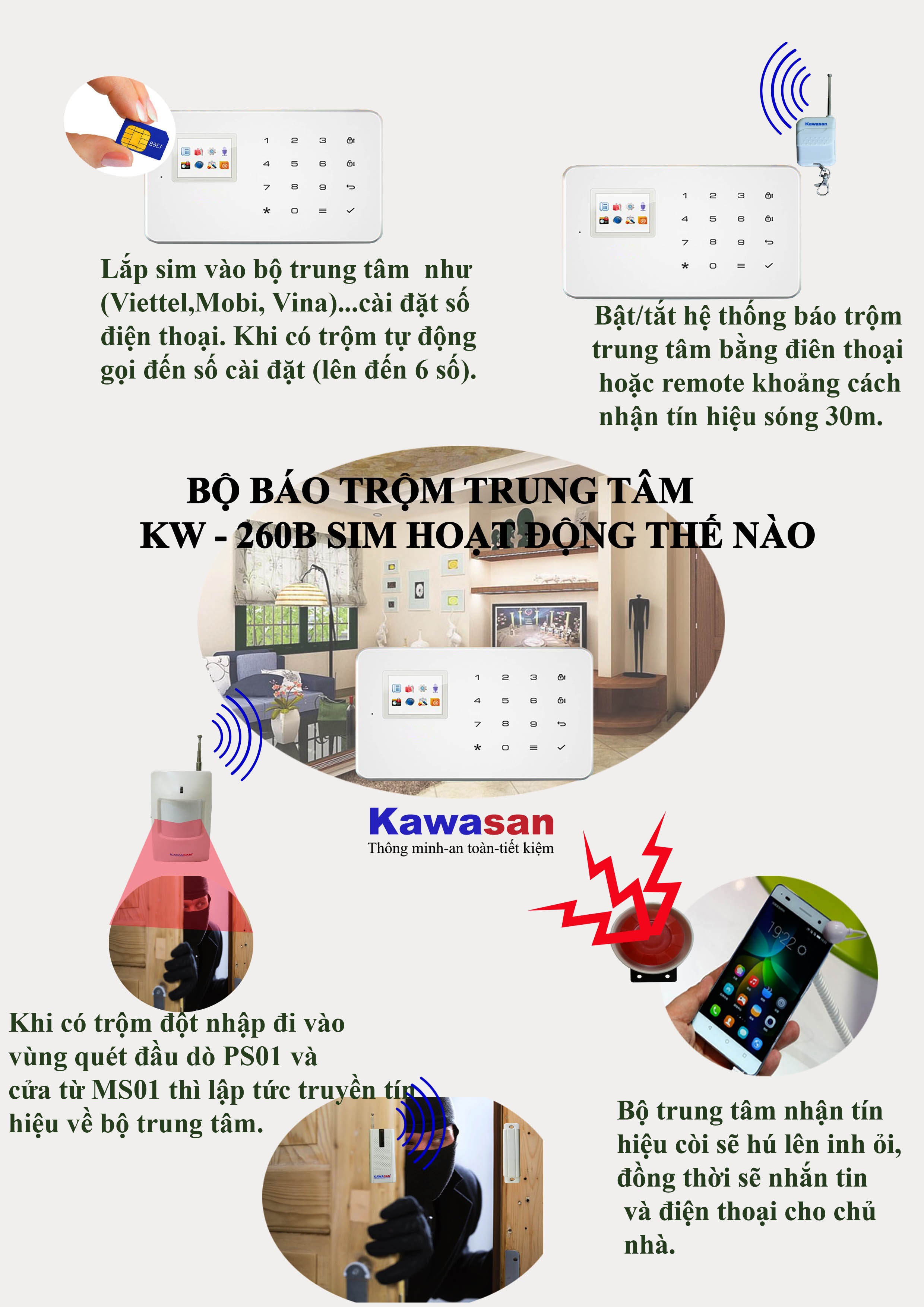 Bộ báo trộm qua điện thoại dùng Sim Model KW-260B sim, cài đặt 6 số điện thoại, màn hình hiển thị LCD kỹ thuật số, kết nối không dây được tối đa 99 thiết bị không dây và 2 thiết bị có dây, chức năng gọi điện thoại cho chủ nhà khi có kẻ gian đột nhập. Thiết bị Kw-262T thích hợp cho gia đình, văn phòng, chợ, tiệm vàng…