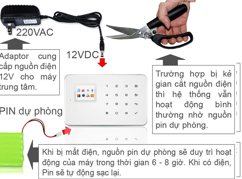 - Nguồn pin dự trữ: NI-HI AAA * 5 DC6V (có sẵn) phòng khi cúp điện, thời gian chờ 8h~12h.
