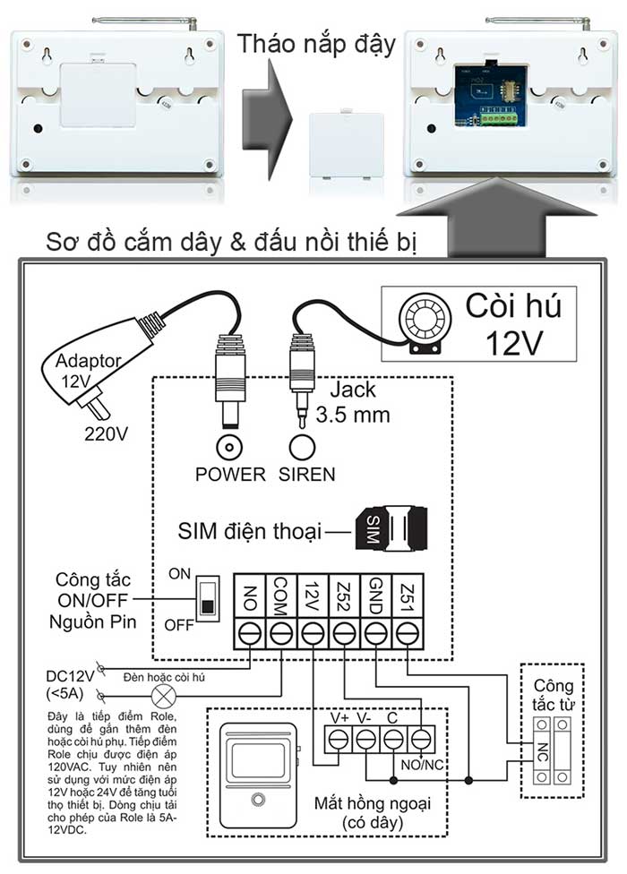 - Công suất tiêu thụ: <55mA, khi báo động: 450mA.