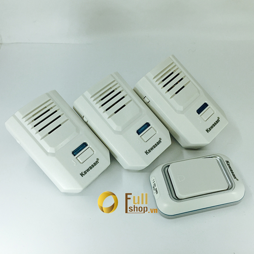 Bộ sản phẩm bao gồm 1 nút nhấn và 3 chuông không dây