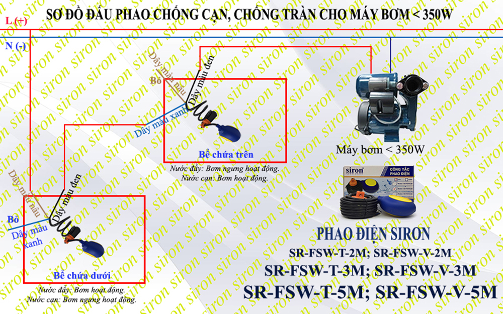 Sơ đồ đấu như sau: Cấp nguồn cho Rơ le phao điện, bộ rơ le sẽ chuyển thành dây tín hiệu 12V DC lên phao điện, khi có tín hiệu trở về bộ Rơ le sẽ đóng mạch điện cho máy bơm chạy. Nguồn tải và nguồn điều khiển hoàn toàn cách ly nhau nên rất an toàn ngay cả khi Rơ le gặp sự cố.