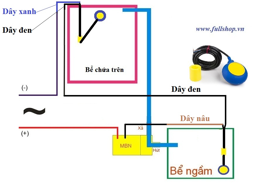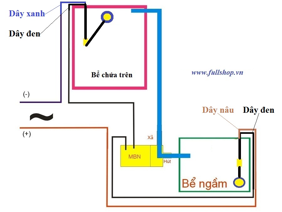 Nguồn điện đươc nối 1 pha vào phao trên bể chứa trên rồi nối xuống máy bơm, 1 pha được nối với phao dưới bể chứa ngầm và nối vào máy bơm.
