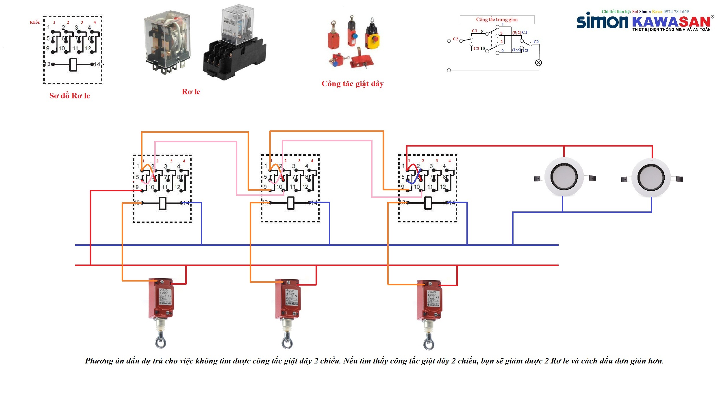 * Nếu có công tắc giật dây 2 chiều thì khối công tắc đầu và khối công tắc cuối thay thế bằng công tắc giật dây 2 chiều.