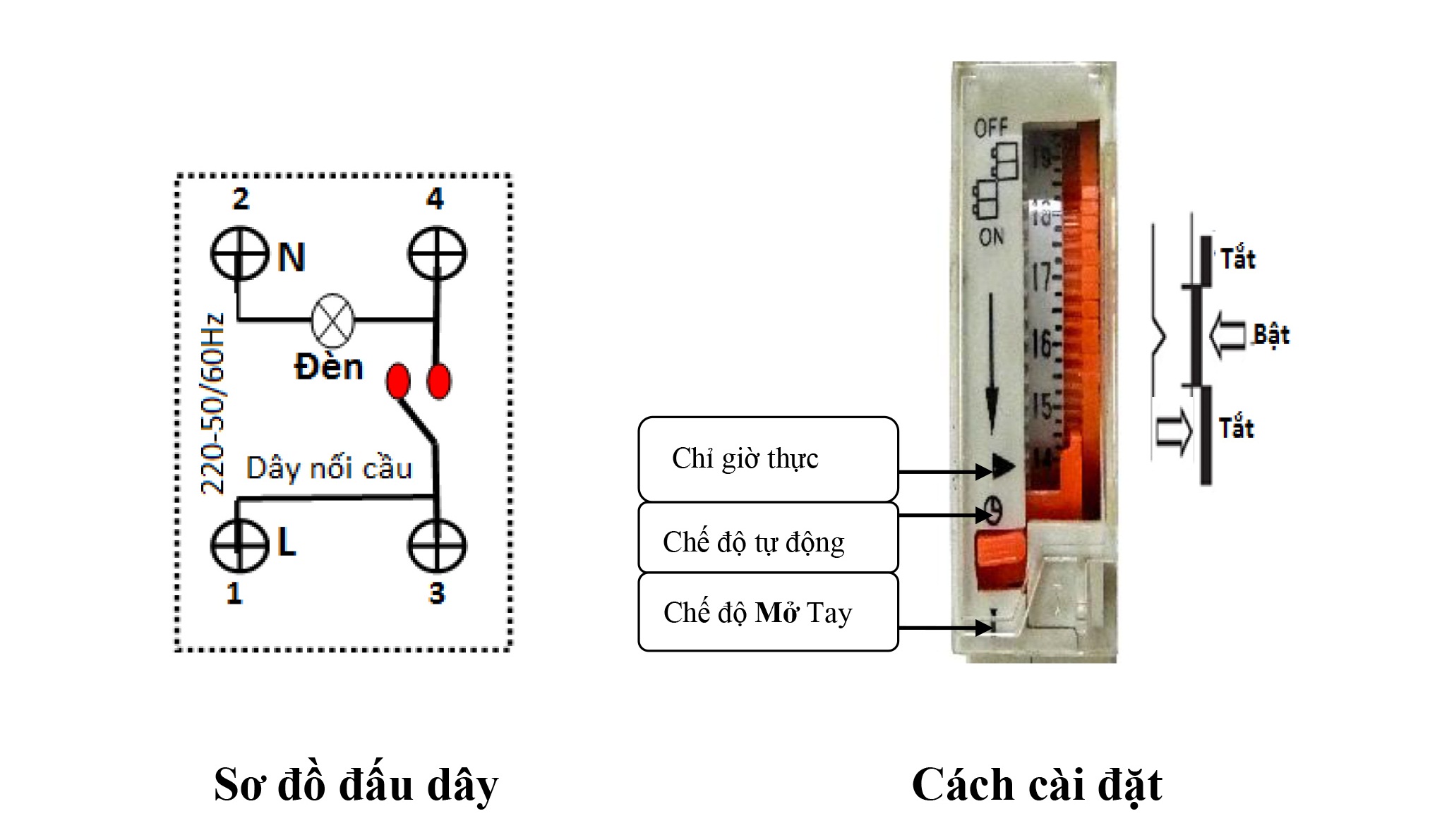 - Cấp cầu nối Teminal "1" vào teminal "3" khi thiết bị đến chế độ hẹn giờ "Bật" thì "3" và "4" đóng (Tải có điện dùng nguồn 220V AC).