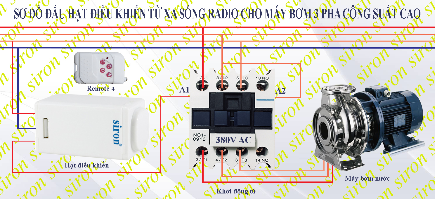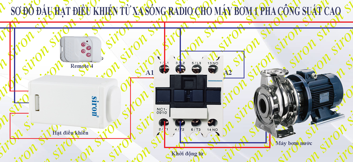 Sử dụng ổ cắm điều khiển từ xa, hạt công tắc điều khiển từ xa cho ứng dụng điều khiển trong vòng bán kính từ 5m đến 30m: Nếu muốn điều khiển được máy bơm nước có công suất cao hoặc máy bơm nước 3 pha bạn cần sử dụng thêm thiết bị chịu tải thay cho thiết bị điều khiển là khởi động từ, khởi động từ sẽ làm nhiệm vụ đóng để bật máy bơm hoặc mở để tắt máy bơm.