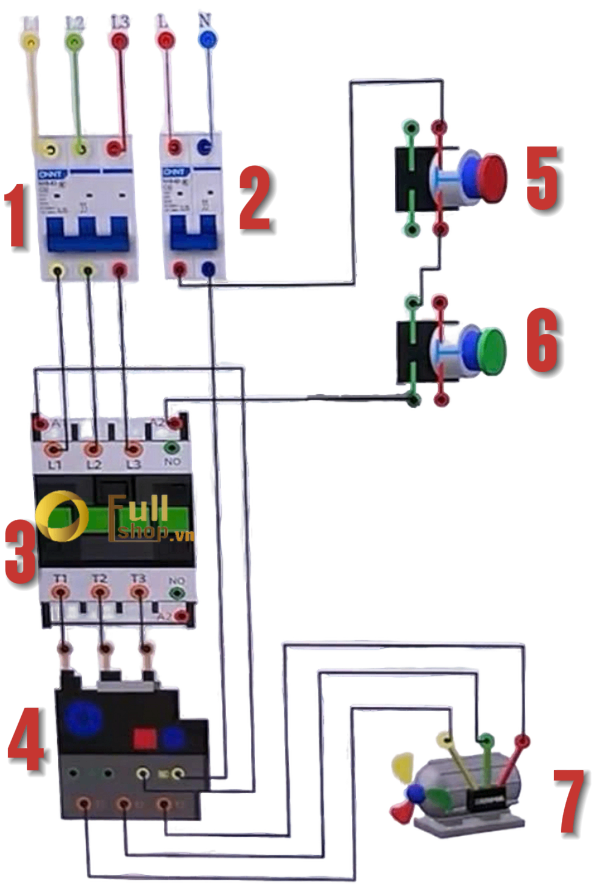 Hướng dẫn cách đấu tủ điện cho động cơ điện 3 pha khởi động on, off bằng tay có rơ le nhiệt bảo vệ.