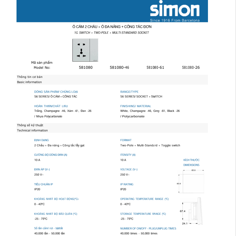 Chất liệu và cấu tạo của ổ cắm đa năng kèm công tắcChất liệu và cấu tạo của ổ cắm đa năng kèm công tắc 1 chiều Simon S6 581080 đóng vai trò quan trọng trong việc đảm bảo tính an toàn và bền bỉ của sản phẩm. Chất liệu cao cấpMột trong những yếu tố hàng đầu làm nên sự xuất sắc của Simon S6 581080 chính là chất liệu sản xuất. Sản phẩm được làm từ nhựa ABS chịu nhiệt, giúp hạn chế tối đa rủi ro cháy nổ khi có sự cố về điện xảy ra. Ngoài ra, lớp vỏ ngoài của ổ cắm còn được thiết kế với khả năng chống bụi, giúp duy trì độ sáng bóng và tính thẩm mỹ qua thời gian. |