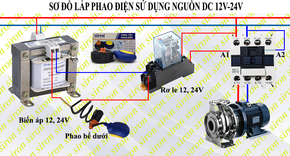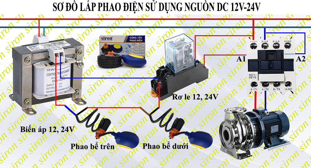 Sơ đồ cách lắp đặt phao điện chống cạn chống tràn bằng nguồn 12V-24VDC
