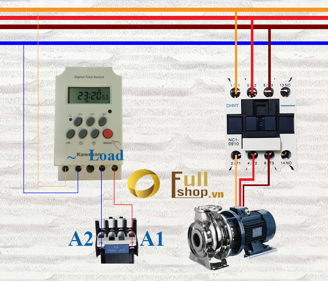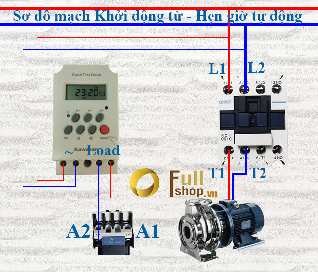 Sơ đồ lắp đặt thiết bị công suất lớn, hẹn giờ máy bơm 1 pha và hẹn giờ máy bơm 3 pha